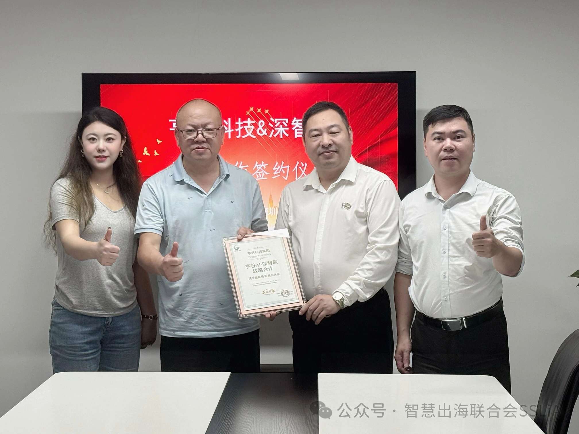 近日,深圳亨谷科技集团有限公司董事长、深圳市福建南靖商会会长、深圳市漳州商会秘书长陈建文,深圳市亨谷AI市场部负责人、亨谷AI总经理、工信部文化发展中心AIGC课程导师徐茂桐一行到访深圳市智慧生活产业联合会,并举行战略合作签约暨授牌仪式。