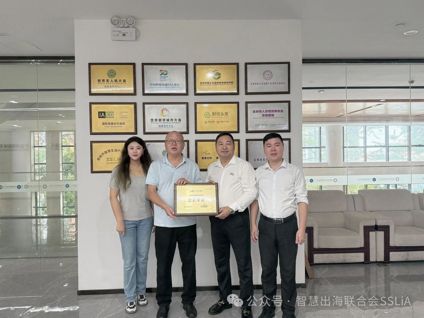 (图:左→右深圳市智慧生活产业联合会会长助理梅宇、深圳市智慧生活产业联合会常务秘书长唐文阁、深圳亨谷科技集团有限公司董事长陈建文、亨谷AI市场部负责人徐茂桐)