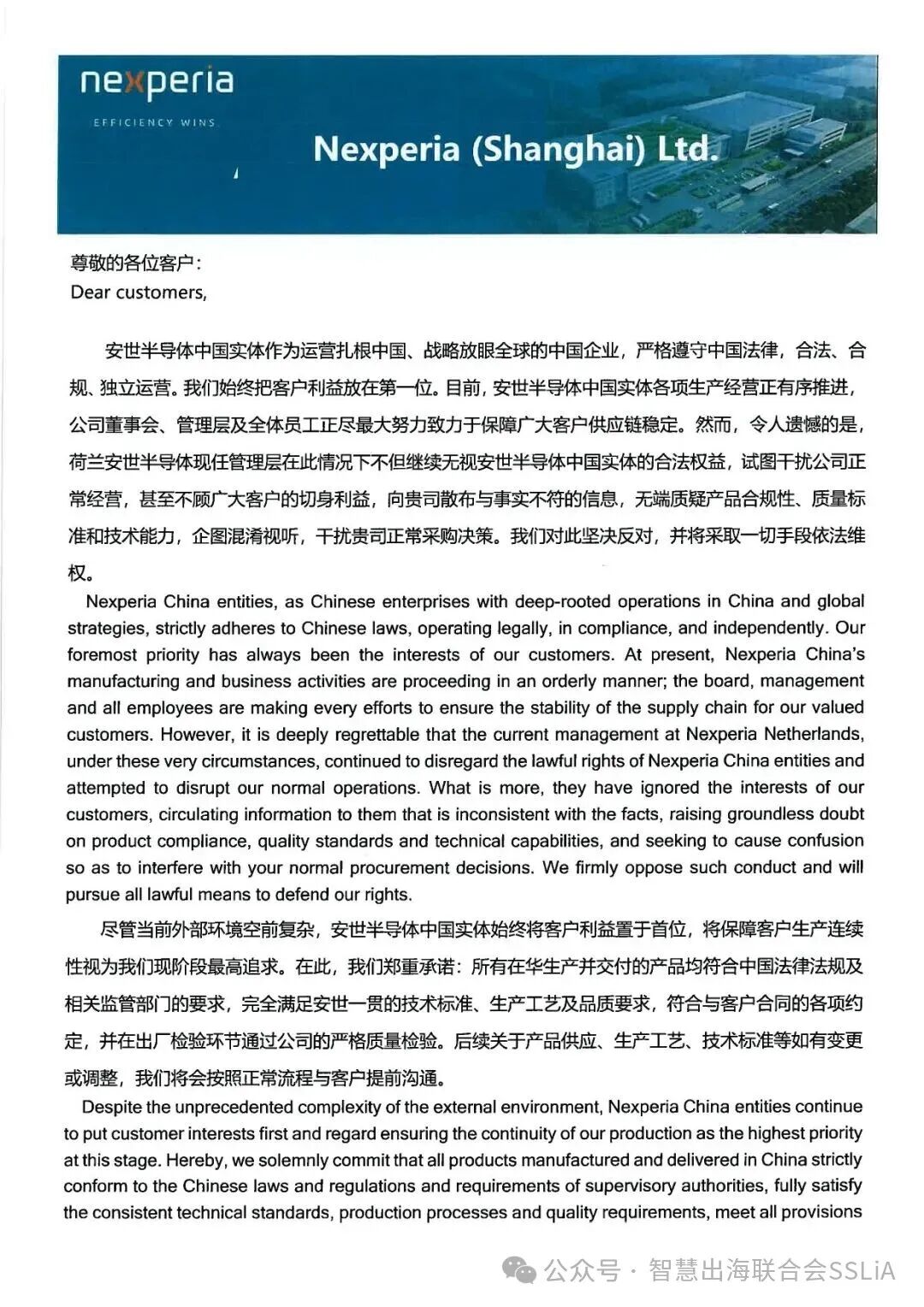 10月23日,安世半导体中国公司发布《致客户一封信》,表示其在华实体运营有序,董事会与管理层正全力保障供应链稳定,所有在华生产并交付的产品均严格遵循中国法律法规与公司质量标准,确保符合合同约定并经过严苛质量检验。