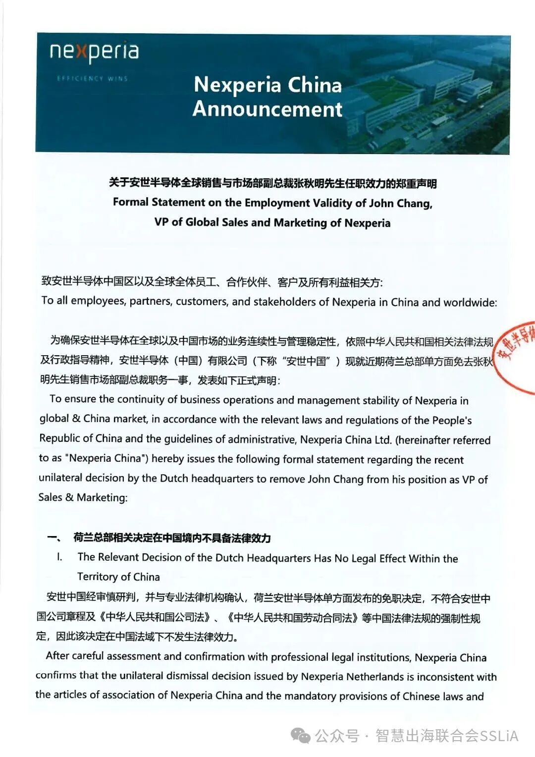 10月23日,安世半导体(中国)有限公司针对全球销售与市场副总裁张秋明先生的职务效力问题发布官方声明。声明指出,荷兰总部单方面作出的免职决定在中国法域内不具备法律效力,张秋明先生作为公司全球销售市场副总裁的身份与职能维持不变,其在职权范围内的行为继续代表安世中国。