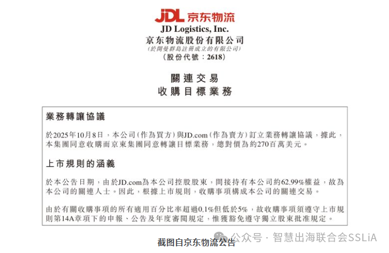 2025年10月9日,京东物流(02618.HK) 发布公告,宣布与其控股股东京东集团签订协议,将以约2.70亿美元的对价,全面收购京东集团旗下的本地即时配送服务业务,包括达疆及达盛两家全资子公司。